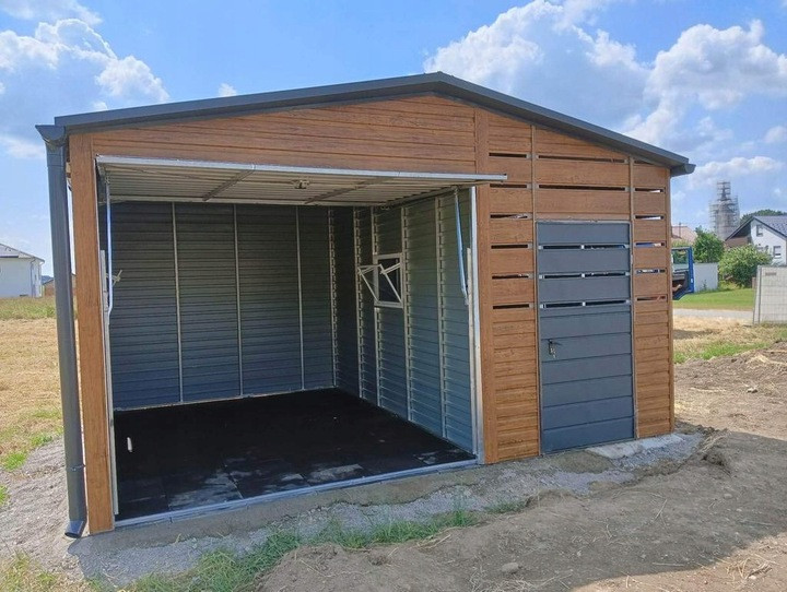 doplnená o praktický 2 m bočný prístrešok ponúka moderný dizajn, vysokú funkčnosť a dlhú životnosť. Vďaka kombinácii elegantného drevodekoru Zlatý dub a kontrastnej brány v odtieni RAL 7016 pôsobí luxusne a harmonicky. Štítová strecha so škridlovou krytinou a odkvapovým systémom zaisťujú spoľahlivú ochranu pred dažďom aj snehom.