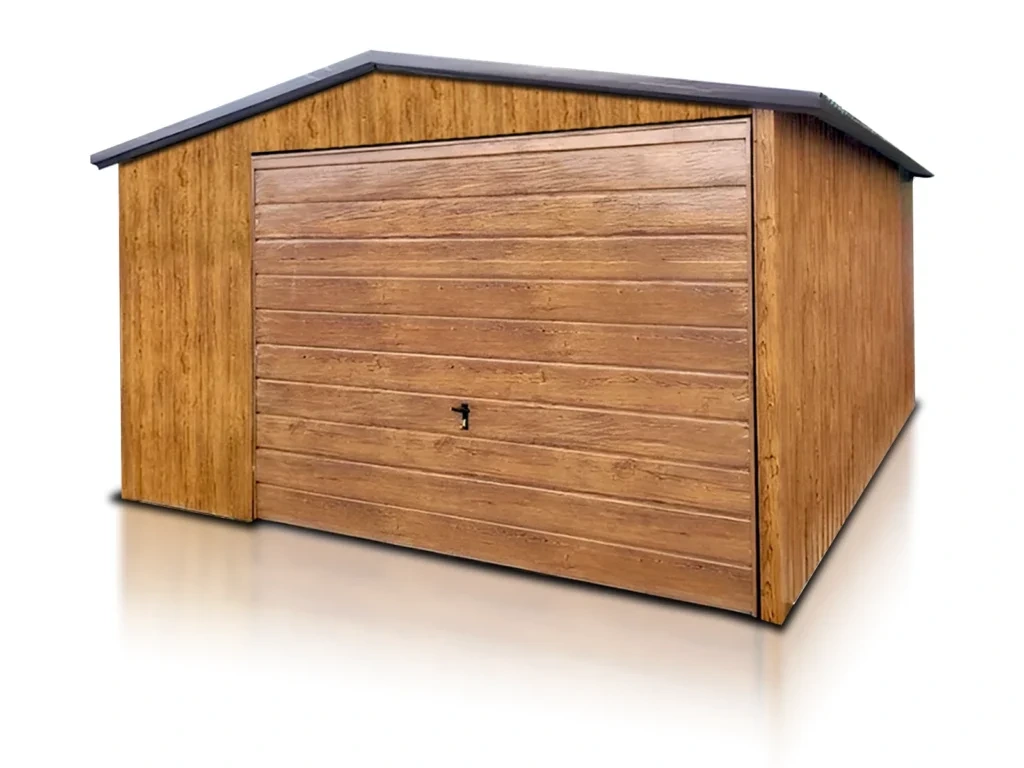 Plechová garáž v dekore Zlatý Dub s hnedou strechou RAL 8017 pôsobí elegantne, moderne a dokonale ladí s rodinným domom alebo záhradou.