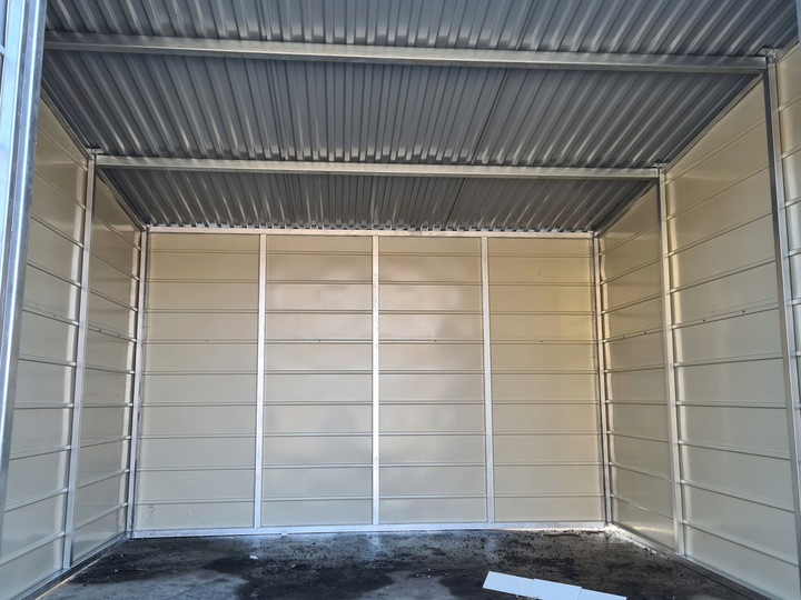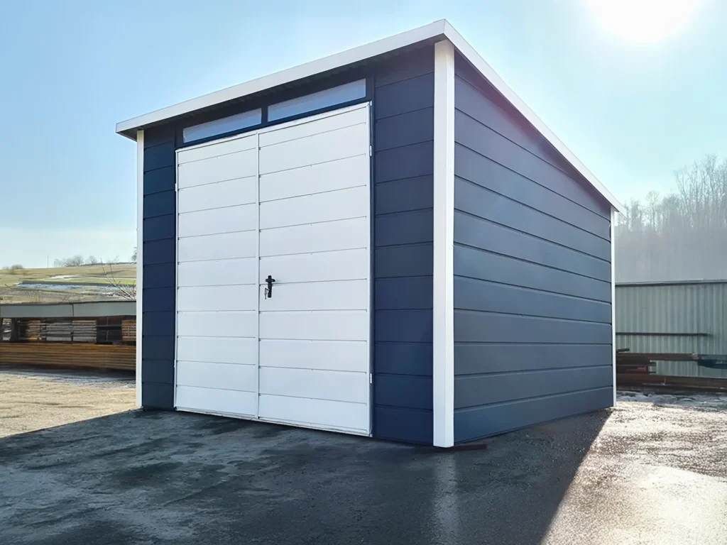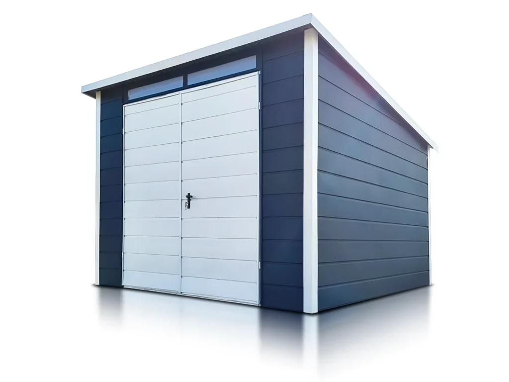 Praktický a pevný záhradný domček s veľkorysým vstupom cez dvojkrídlovú bránu – ideálny pre každého, kto hľadá riešenie na uskladnenie náradia, kosačky, bicyklov alebo sezónnych vecí.